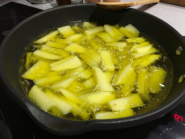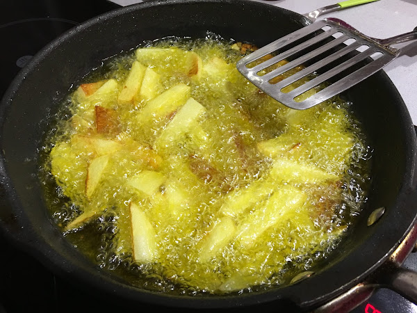 2. Cubrimos una sartén con aceite de oliva y empezamos a freír las patatas.