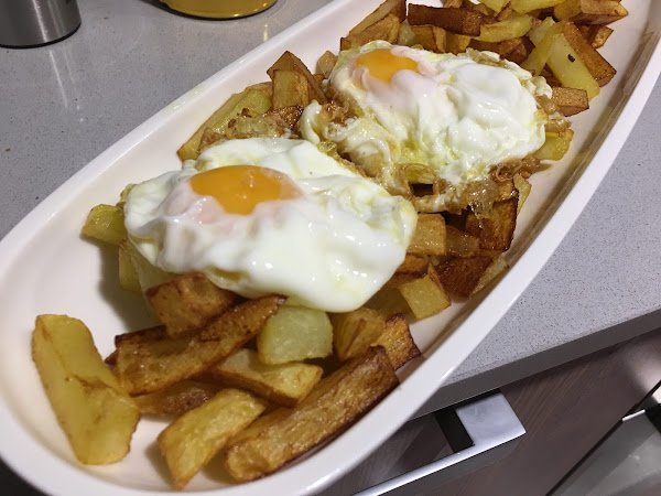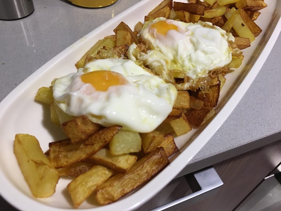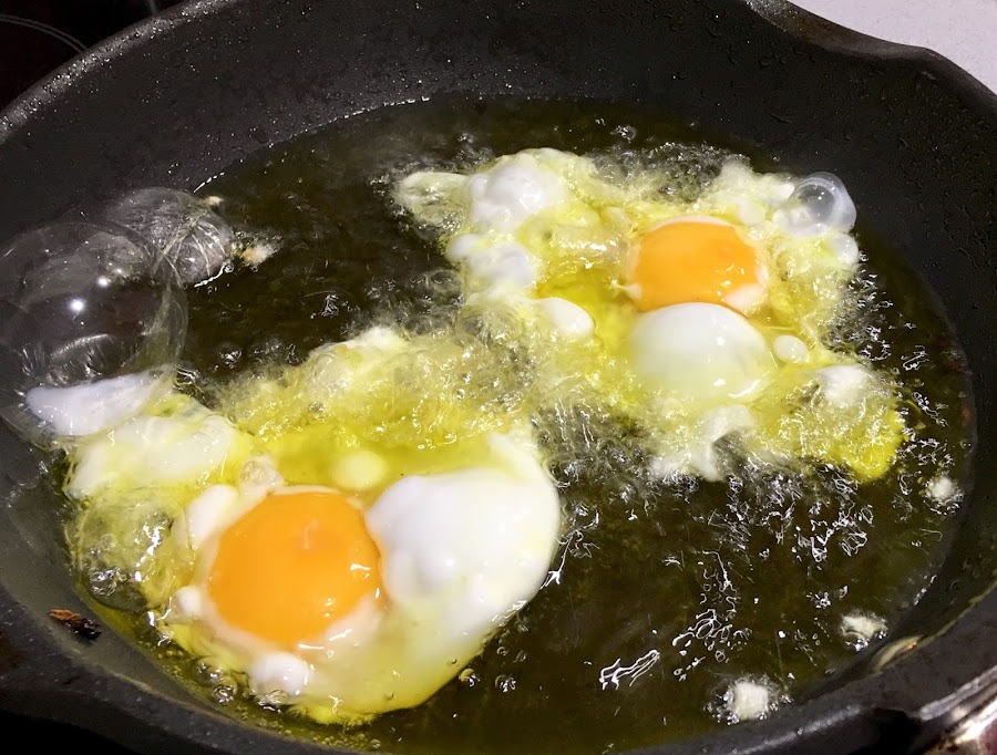 3. Ponemos aceite de oliva virgen extra en una sartén y freímos de dos en dos los huevos. A fuego fuerte. Cuando estén fritos los retiramos a un plato. Si queréis conseguir que tengan puntilla y que la yema esté en su punto, evitar ponerle aceite por encima, dejarlo tal cuál 2-3 minutos.