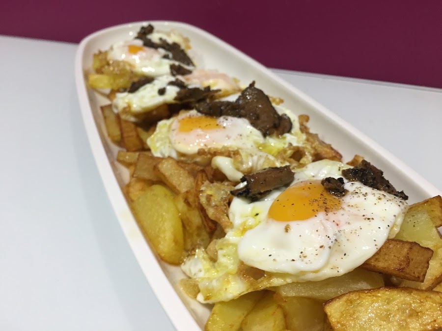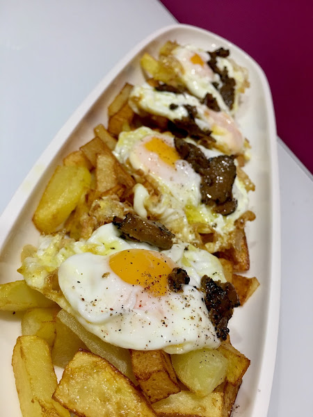 4. Ponemos las patatas en un plato sobre papel absorbente. Después las ponemos encima de otro plato, ya sin el papel. Ponemos encima los huevos. Y encima de éstos, el carpaccio de trufa de la Chinata, recién hecho. Salamos la patatas y los huevos. Servimos caliente.