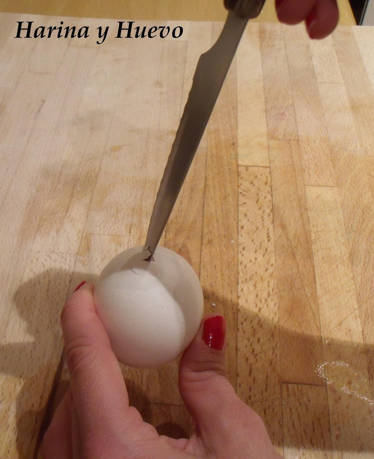 Para ello miramos cual es el "culo" del huevo y lo sujetamos hacia arriba. Con un cuchillo de punta fina y afilada "picamos" suavemente.