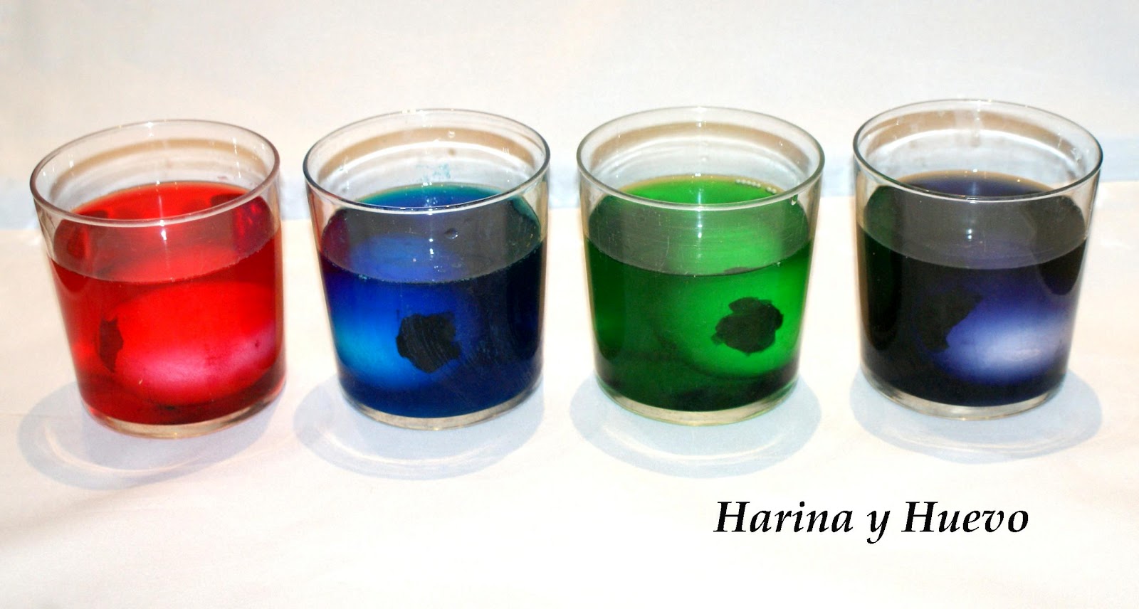 ¡HORA DE COLOREAR! vamos a ir cogiendo un vaso por cada huevo de manera que este quede bien sumergido. Este vaso lo llenamos de agua caliente casi hasta arriba, añadimos un poco de colorante del color deseado y una cucharada de vinagre.
