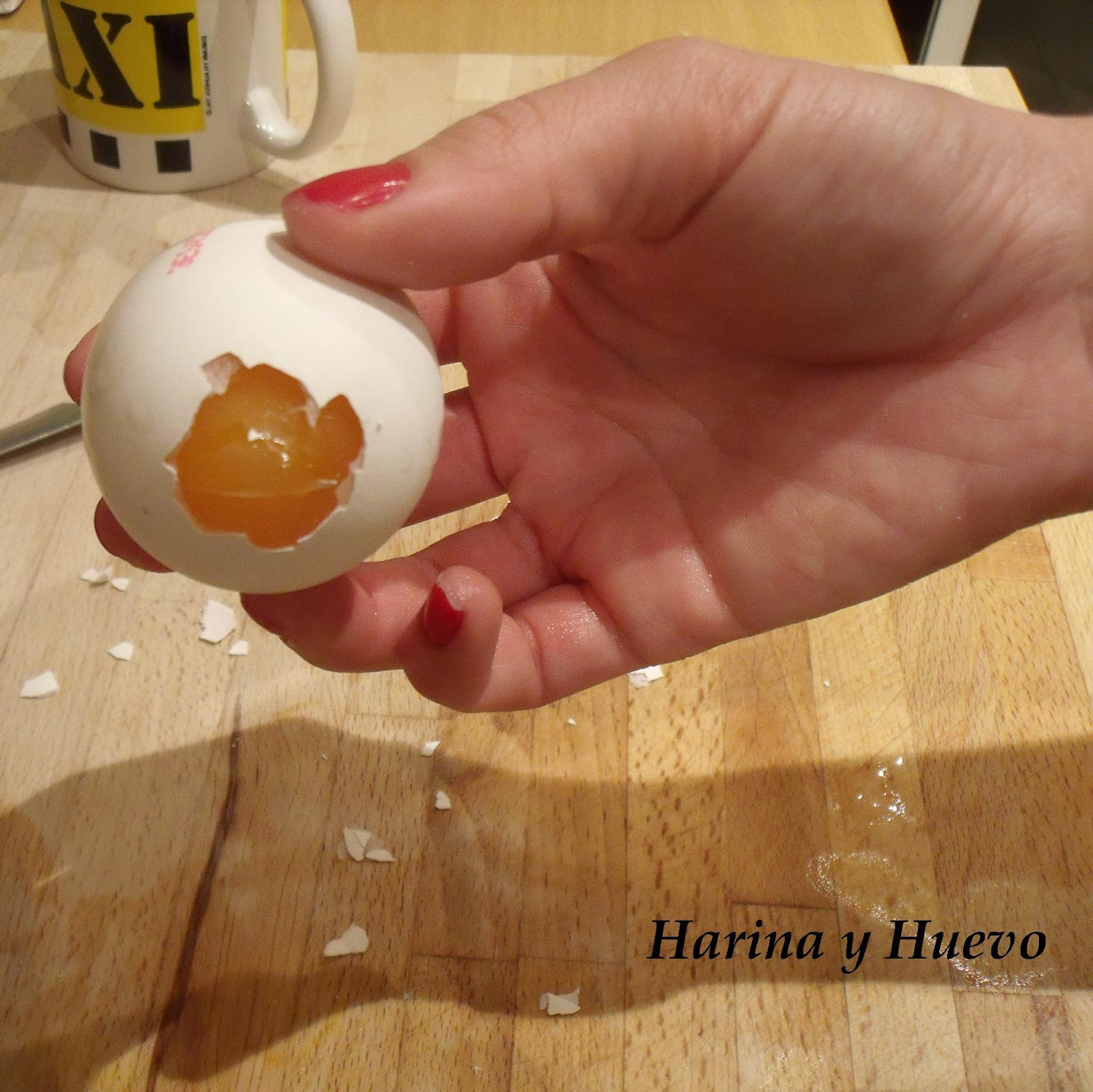 Para que nos sea más fácil también es importante apoyar el huevo en algún sitio y tener las dos manos libres (no como yo) Podemos usar un vaso, un cacharrito para los huevos duros (no sé como se llama) o un molde pequeño como el mío. La cuestión es que nos queden estables y con el agujero hacia arriba.