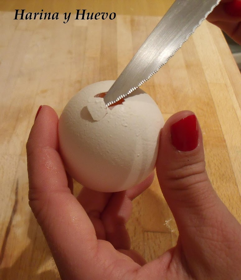 El hueco que hagamos tiene que ser lo suficientemente grande para que podamos sacar el interior y lo más importate, para que podamos rellenarlo; pero lo suficientemente pequeño para que no se note mucho y el huevo siga teniendo, pues eso, forma de huevo.