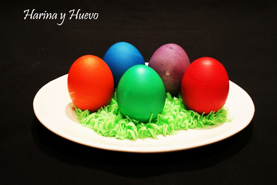 Ahora queda presentarlos, para ello he puesto una base de buttercream en un plato imitando cesped. He usado boquilla de cesped nº 233. Luego he puesto los huevos encima y este este es el resultado. ¿Qué os parece?