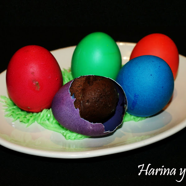 La única pega de esta receta: pues que despegar el bizcocho del huevo cuesta un poco y se queda pegado a la cascara. Pero esto mismo podéis hacerlo con unos huevos duros. Seguro que a vuestros hijos les encanta estos huevos de colores.