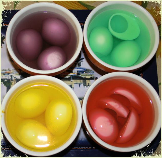 Escoger uno o varios colorantes alimentarios, mezclarlos con el agua, remover para que se reparta el color uniformemente, y sumergir los huevos enteros o partidos sin la yema y dejarlos hasta que estén con la intensidad de color que a vosotros os guste más.