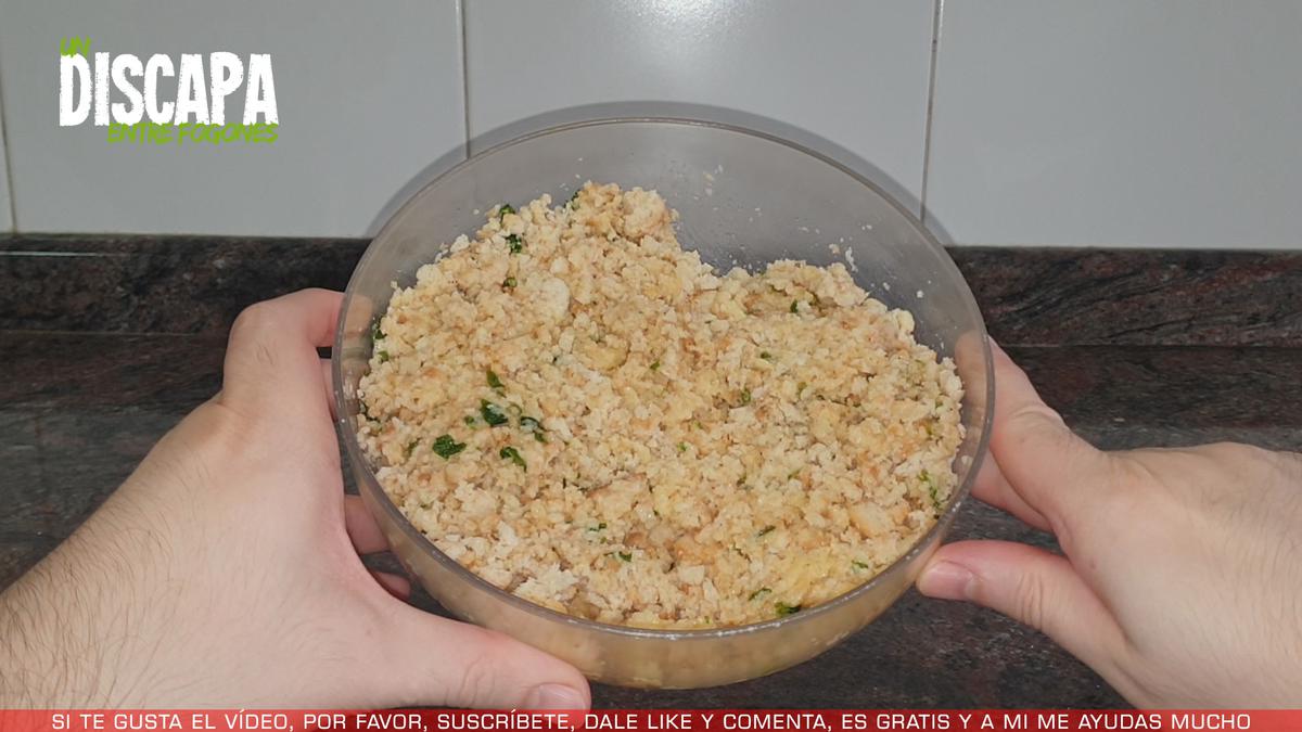 Ahora añadimos el pan triturado a un recipiente más amplio y como podéis ver no hace falta que quede súper triturado.