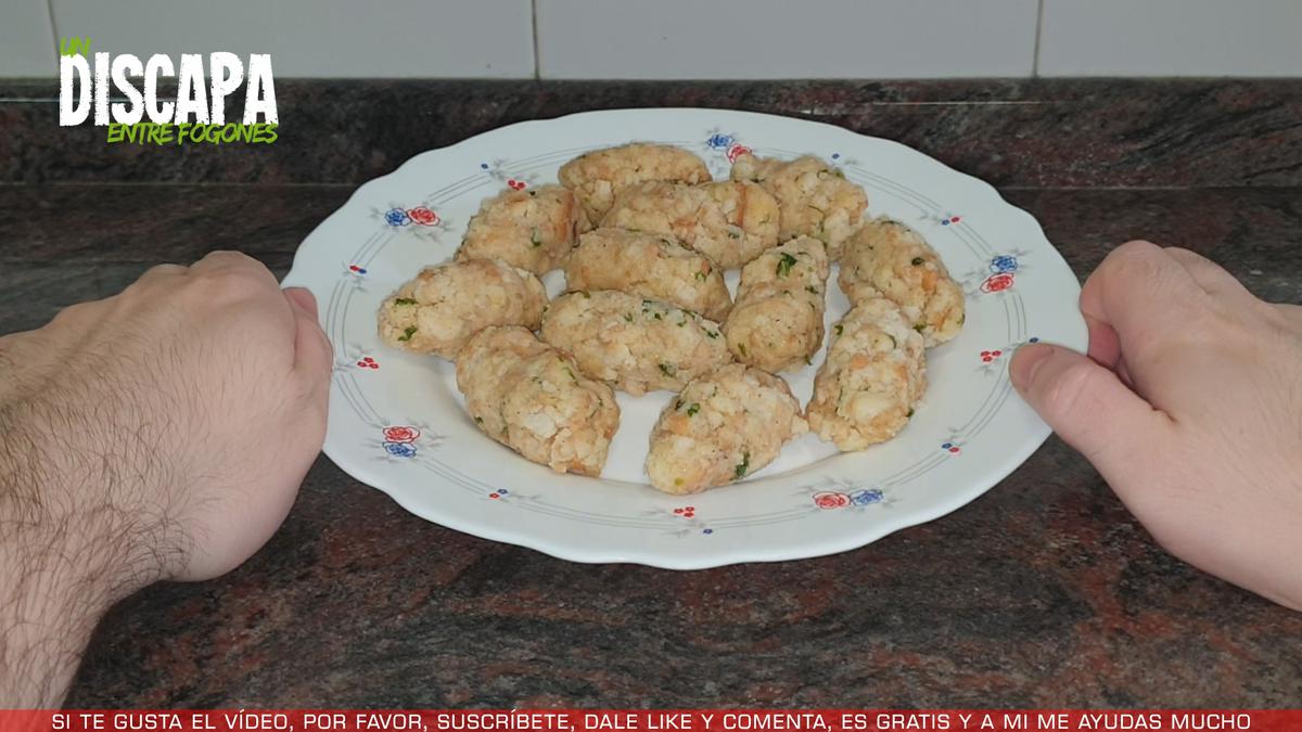 3Pasados unos 30 minutos, cogemos porciones con la ayuda de una cuchara y con las manos bien limpias le vamos dando forma de croqueta.