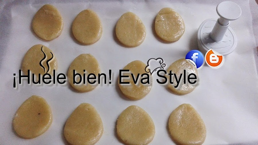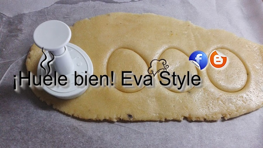 4.- Cubrimos una superficie con azúcar glass. Amasamos un poco con las manos limpias el fondant blanco, Extendemos con un rodillo para fondant, cortamos la pasta con el molde de huevo. Una vez este fría las galletas las cubrimos con el fondant, unimos las pasta a las galletas con los dedos. Cortamos también el fondant amarillo con los moldes y colocamos las figuras de conejo y pollito sobre los huevos.