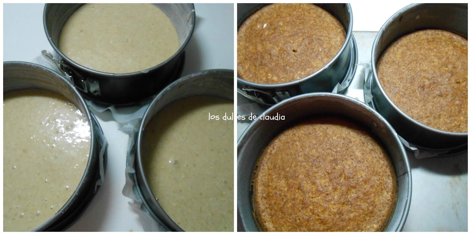 Quería un bizcocho pequeño y utilizar tres moldes de 18 centímetros cada uno, así que hice media receta.