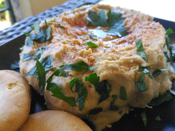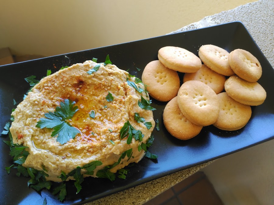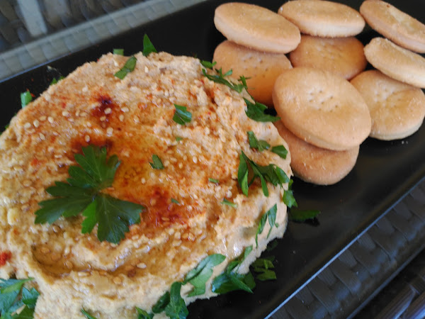 - Una vez bien triturado todo, servir el hummus en una bandeja o bol, espolvorear pimentón y sésamo, y un chorrito de aceite, y servir con el perejil fresco bien picadito, acompañado de algún pan que se pueda mojar.