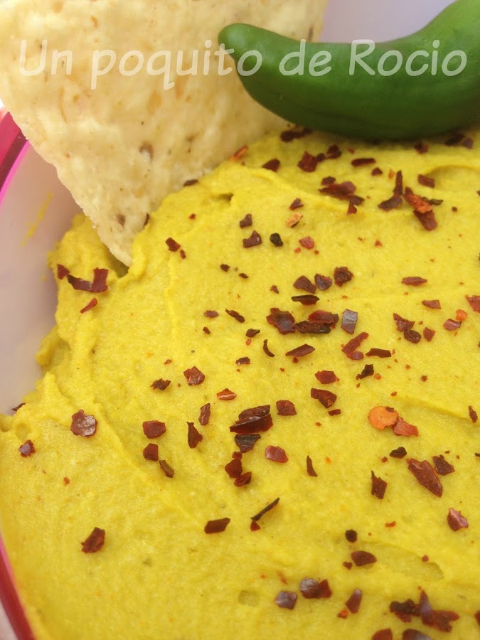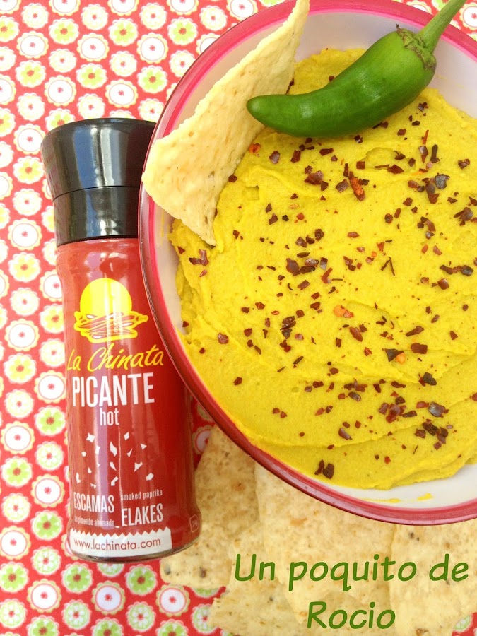 Necesitamos un tarro pequeño de garbanzos cocidos lavados, un aguacate, el zumo de una lima, medio diente de ajo, sal, pimienta, media cucharadita de curry, media cucharadita de cúrcuma, un poquito de pimentón dulce ahumado y dos cucharadas de aceite de oliva virgen extra. Lo ponemos todo en el vaso de la batido y trituramos hasta que tengamos una pasta. Lo pasamos a un bol y decoramos con escamas de pimentón picante La Chinata. Servimos acompañado de tortitas de maíz y listo, a disfrutar del verano!