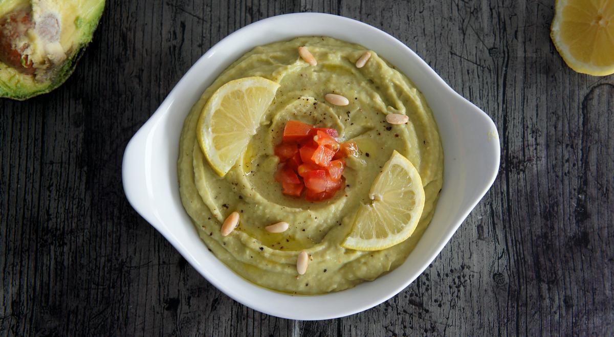 Cortamos el aguacate por la mitad, le retiramos el hueso y sacamos la carne con ayuda de una cuchara. Lo trituramos con ayuda de una batidora junto con los garbanzos, el diente de ajo y un chorrito de agua.