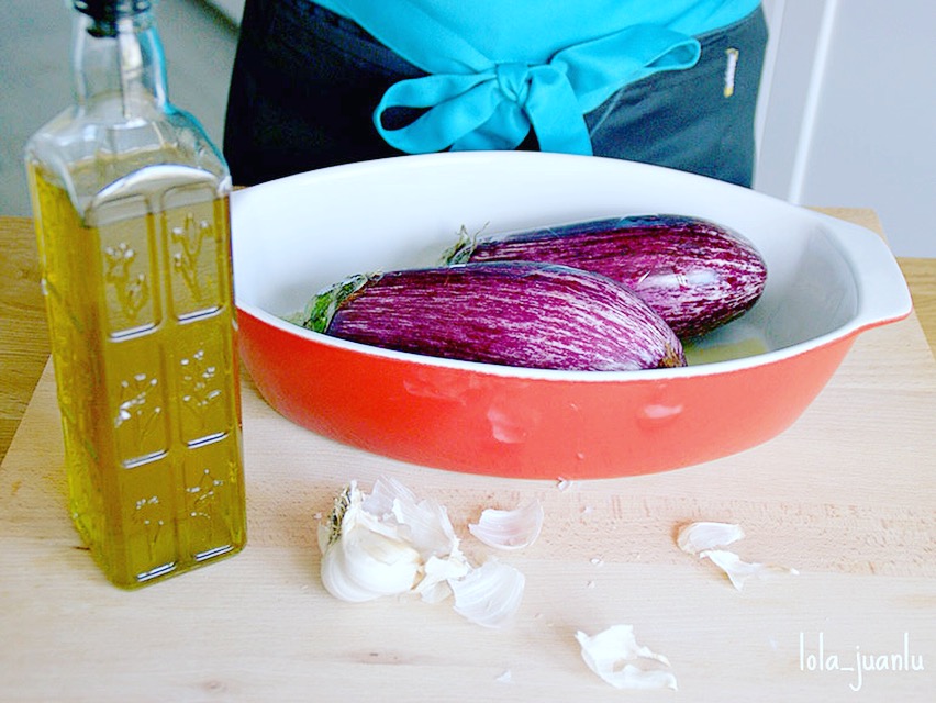Colocamos las berenjenas y los ajos sin pelar en una fuente para hornear o directamente en la bandeja de horno sobre papel de hornear. Rociamos con aceite de oliva virgen extra y asamos durante una hora.