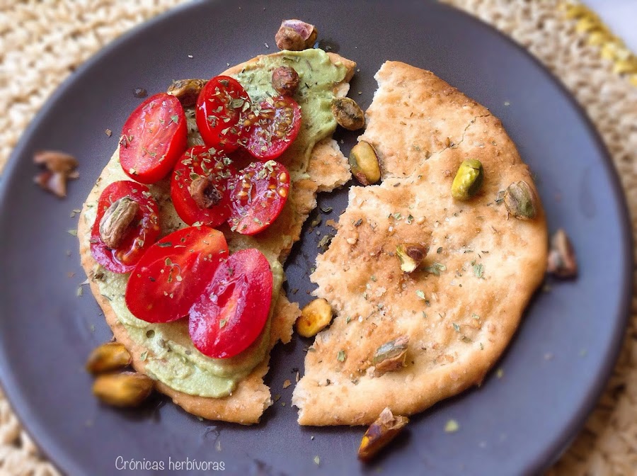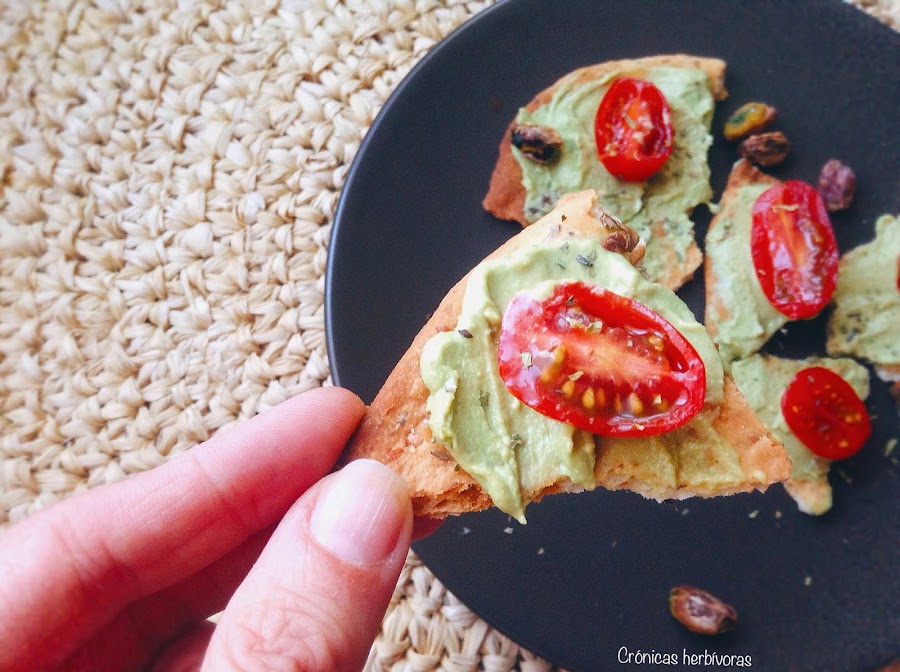 Para servir este hummus, cuya base es la clásica, usé las famosas tortas sevillanas de Inés Rosales (son veganas en todas sus variedades) y en concreto la variedad de sésamo. Podéis usar las tortas para dipear partiéndolas en trozos irregulares igualmente.