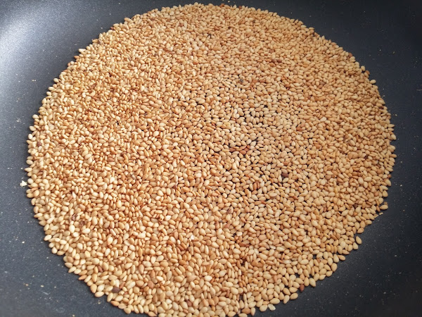 1. - Primero pondremos las semillas de sésamo en una sartén y las tostaremos un poco. Y las dejamos enfriar.