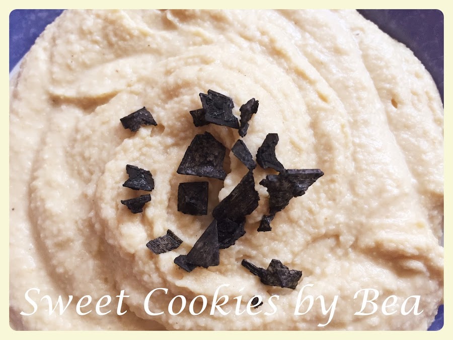 Ponemos en el cuenco y adornamos con lo que mejor nos parezca, yo le he puesto unas escamas de sal negra pero puedes ponerle un chorrito de aceite y pimentón dulce, unos garbanzos enteros o ajonjoli, al gusto del consumidor.