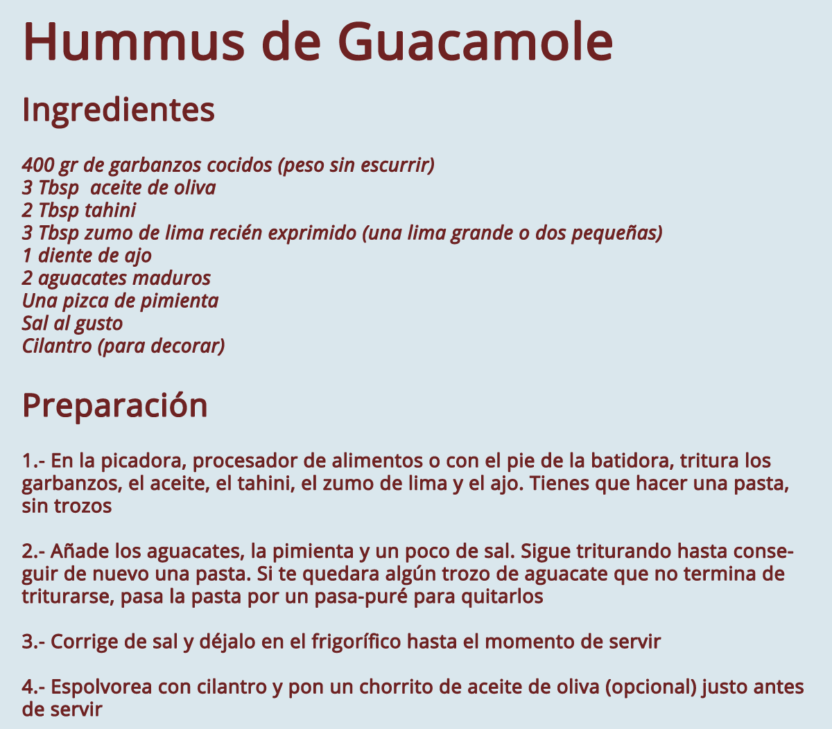 Por casualidad encontró esta receta, que debe el color verde al aguacate. Además hace tiempo que quería probar el hummus, que tan famoso se ha vuelto últimamente, Y como este es de guacamole, vale igual acompañado de pan de pita, que de nachos