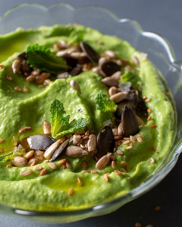Para preparar este hummus podéis utilizar tanto guisantes frescos como descongelados, y el resto de ingredientes son los típicos del hummus más alguno extra como la menta que le va a dar un toque fresco muy especial.