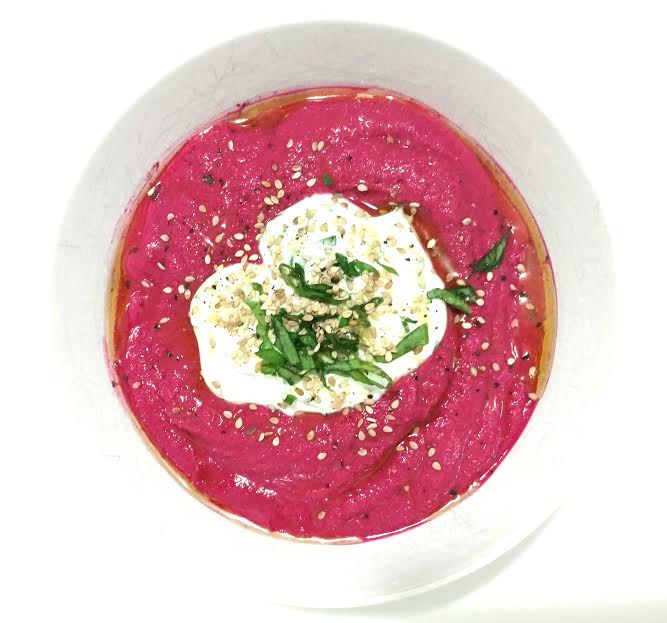 Colocar en el vaso de la batidora la remolacha cortada en trozos y previamente pelada, los garbanzos escurridos, el ajo pelado, el tahini, el comino, el jugo de media lima, sal, pimienta, un chorrito de agua y batir unos minutos. De textura os recomiendo que lo dejéis con pequeños grumos, que no se quede demasiado cremoso.