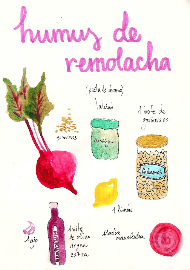 Esta receta es muy sencilla, rápida y fácil de preparar. Tan solo tenemos que triturar en el vaso de la batidora hasta dejar hecha una crema todos los ingredientes juntos; la remolacha, el ajo, los garbanzos, el zumo de limón, el tahine, los cominos, la sal y dos cucharadas de aceite de oliva virgen extra.