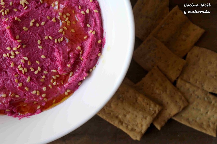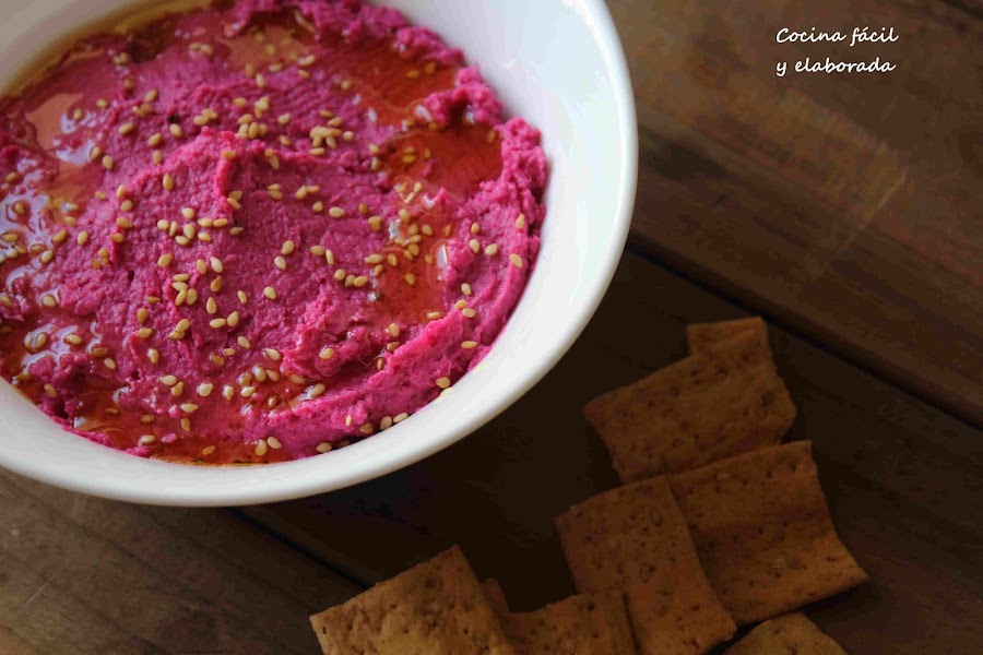 El hummus es una comida sana y deliciosa, este hummus de remolacha es uno de los que más me gusta. La remolacha cocida le da un sabor increíble. De color no digo nada, solo tenéis que mirar las fotos, entra solo por la vista. Fácil de hacer, en un par de minutos lo tienes. De todas formas yo te recomiendo que dediques un poco de tiempo y en vez de garbanzos cocidos de bote y remolacha cocida compres los ingredientes naturales y los cocines tú, El sabor es todavía más espectacular.