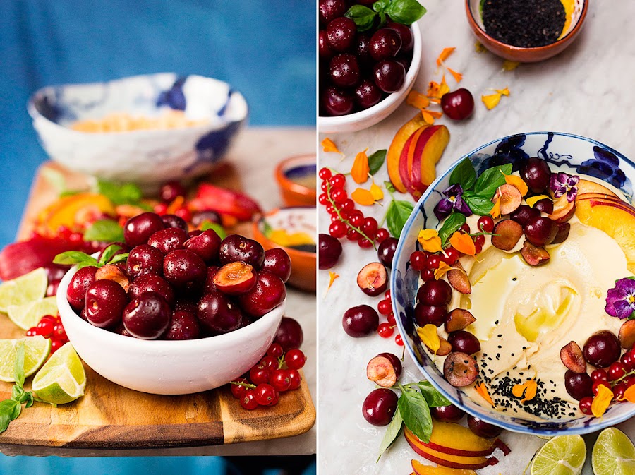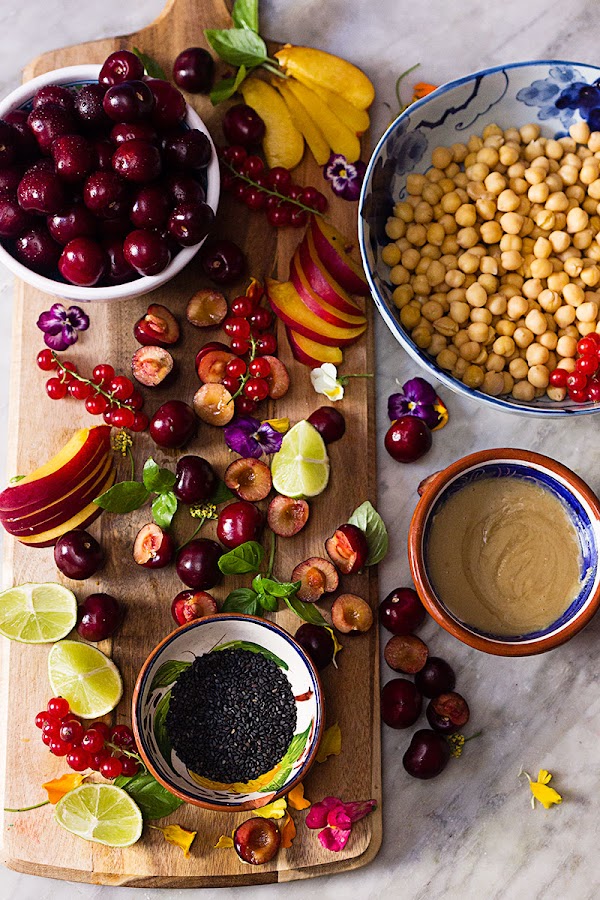 En ésta ocasión, he sustituido el pan de pita por distintas frutas, a modo de crudités, sobre todo por picotas, dado que su tiempo y la producción es limitada, procuro disfrutar de ellas todo lo posible y preparar recetas de lo mas variadas.