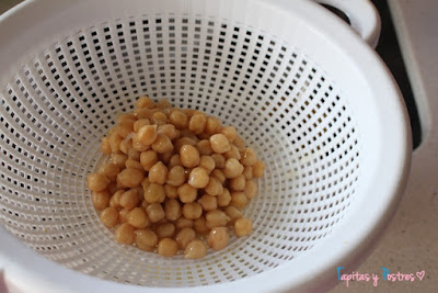 Reservamos el liquido de los garbanzos y enjuagamos bajo el grifo.