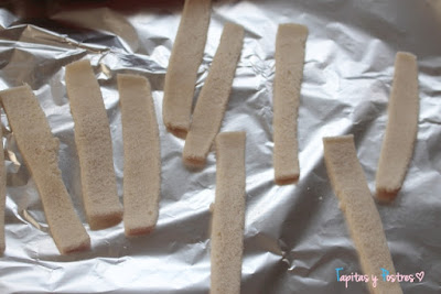 Diez minutos antes de acabar el asado de las zanahorias, vamos a poner un par de rebanadas de pan de molde sin corteza cortadas a tiras. previamente las habremos aplastado con un rodillo y pincelado con aceite. Estad pendientes para que o se os quemen.