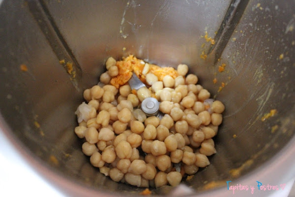 Agregamos los garbanzos y volvemos a triturar unos 30 segundos a velocidad 5. Haremos esto hasta que nos quede un puré fino.
