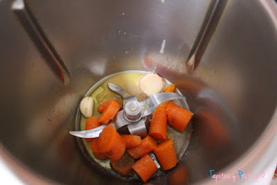 Una vez asadas las zanahorias, le quitamos la piel en caliente, cuidado que quema. Las troceamos y las ponemos en el vaso de la batidora o thermomix junto al ajo, la salsa tahini, la sal, pimienta, comino, zumo de limón, aceite y un poquito del caldo de los garbanzos. Trituramos bien 30 segundos a velocidad 4.