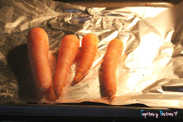 Lavamos bien las zanahorias y las ponemos en una bandeja de horno. Asamos a 180º unos 40 minutos.