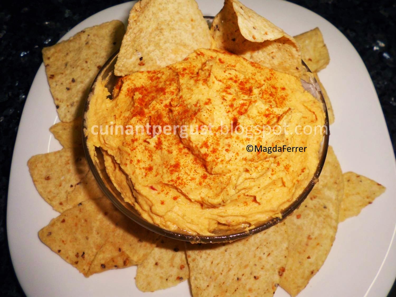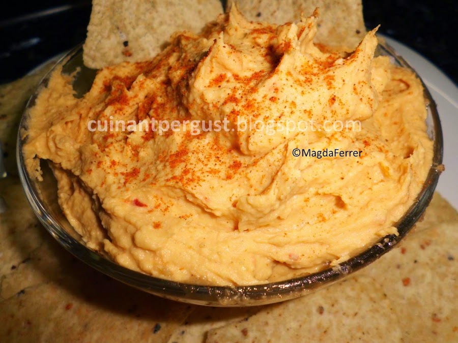 Introducir en la picadora o en el procesador de alimentos el tahini, el boniato troceado, los garbanzos escurridos, la sal, el chile, el pimentón, el zumo de limón y un chorro de aceite de oliva. Triturar e ir comprobando el grado de sal y de picante. Ha de quedar una pasta suave pero consistente. Si queda demasiado espesa añadir más aceite y/o zumo de limón, dependiendo del gusto de cada cual. Depositar en un cuenco o bol, acompañado de tortillas de maíz. Servir.