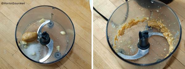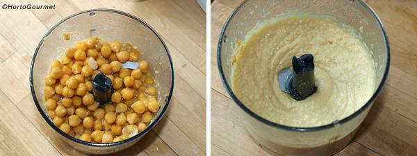 Luego, incorporamos los garbanzos y un poco de agua y volvemos a triturar. A continuación, añadimos un chorro de aceite de oliva y los chorros de zumo de limón. Volvemos a triturar y probamos. Si fuese necesario, podemos añadir un poco más de sal y mezclar de nuevo.