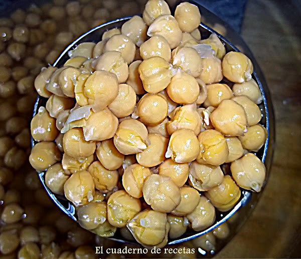 Los cocemos solo con agua y sal. En la olla rápida son quince minutos. Por supuesto también puedes utilizar garbanzos cocidos, si te es más cómodo.