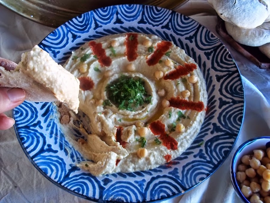 Vas cogiendo trozos de pita y mojándolos en el Hummus, y a disfrutar.