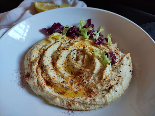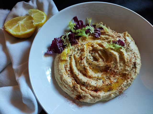 Añade los ajos pelados, la tahina, el comino molido, la sal, el aceite de oliva, el zumo de limón y el agua. Bate.