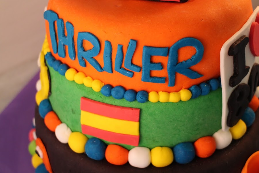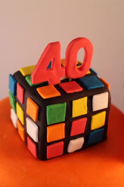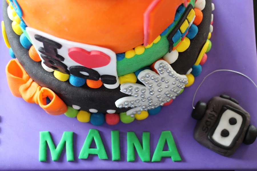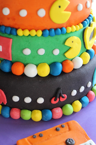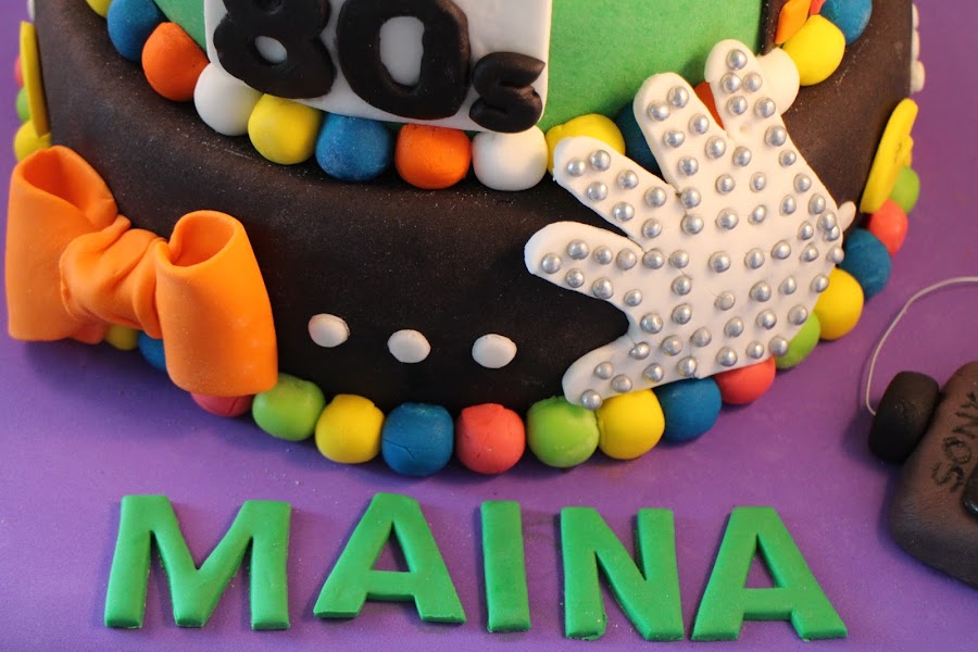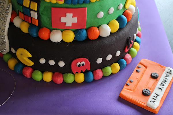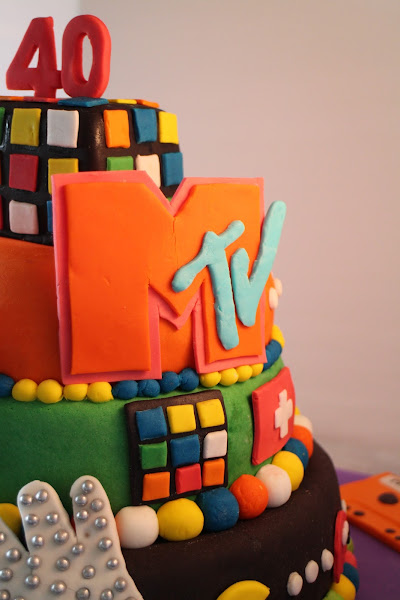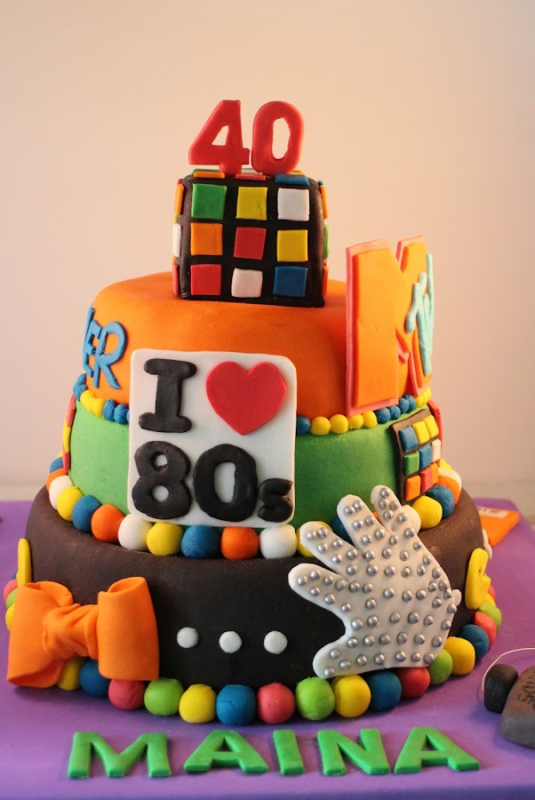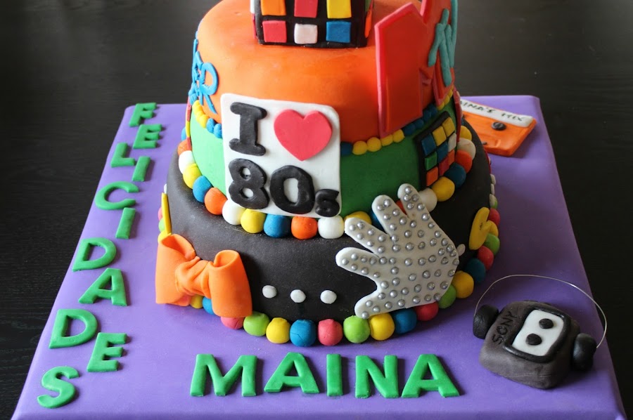 Iconos de aquella época desperdigados por la tarta como los comecocos de Atari, el walkman de Sony, las cintas de cassette, el guante de Michael Jackson, el logo de la MTV y coronándola el cubo de Rubik.