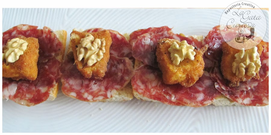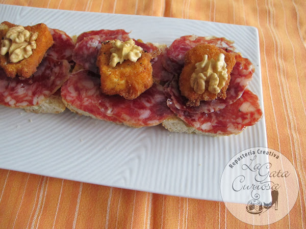 Pasamos por huevo los trozos de queso, luego por el pan rallado y los freímos en abundante aceite solo hasta que estén dorados, solo vuelta y vuelta, colocamos cada uno encima de de un trozo de pan y la media nuez coronando nuestro pincho y a disfrutar.