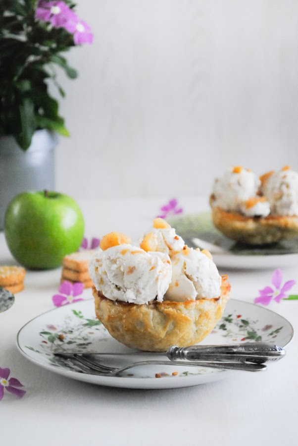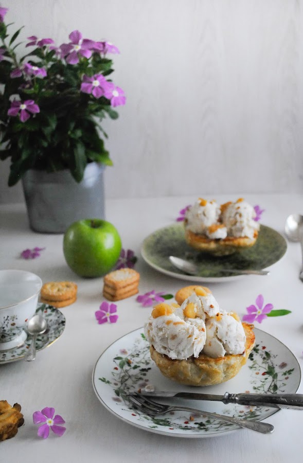 Buscarle el nombre a esta entrada me ha costado no os vayáis a creer, básicamente es un helado de Yogur con trocitos de Manzana caramelizada y galletas de mantequilla, presentado sobre un "Bol" de manzana asada y masa para Pie.