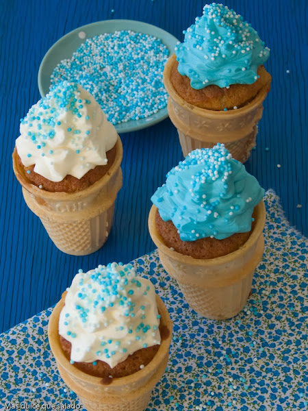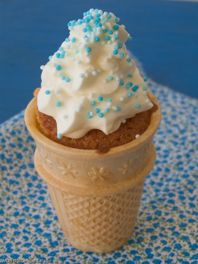 Tenía muchas ganas de hornear estos cupcakes desde que los vi por pinterest hace mil años... pero me faltaban los conos...hasta que los vi en la tienda Iceland que ya os he hablado en varias ocasiones. En realidad los compré para hacer esta receta, pero entre los Cucuruchos de ensaladilla rusa y el Helado de zarzamora, casi tengo que volver de nuevo al Iceland ( pero he decidido que hasta que no acabe con todos los botes de frutas en almíbar, los azúcares de todos los colores y texturas....no pienso volver).