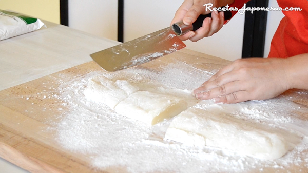 5. Espolvoréate las manos con la maicena y divide el mochi en 14-15 trozos. El mochi está caliente y pegajoso, ten cuidado de no quemarte.