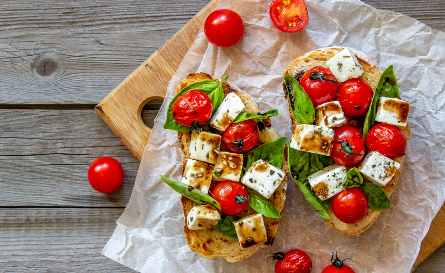 Una mezcla de los sabores más característicos de los países mediterráneos. Pon sobre unas tostadas unos tomatitos cherry, previamente horneados, unos dados de queso feta, unas hojas de albahaca, una pizca de sal y un chorrito de aceite de oliva y vinagre de módena. Más rico y sano imposible.
