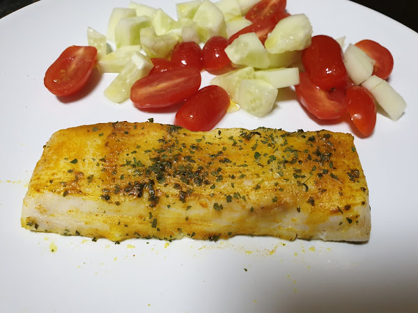 El siguiente, lomo de merluza con cúrcuma y ensalada de pepino y tomates.