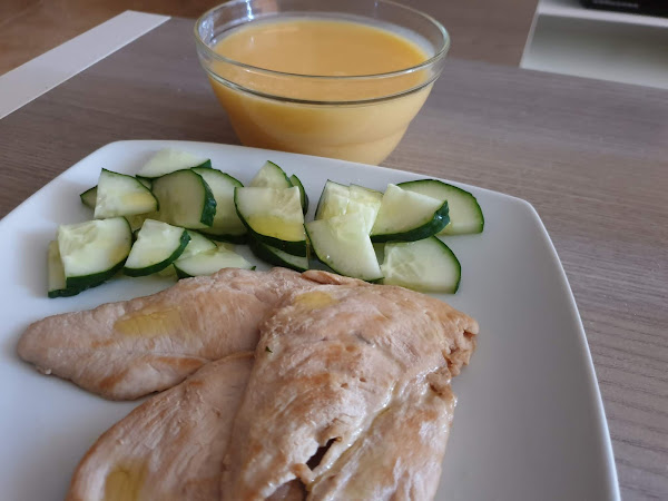 Otra idea, una crema de calabaza, con pollo de soja y pepino.