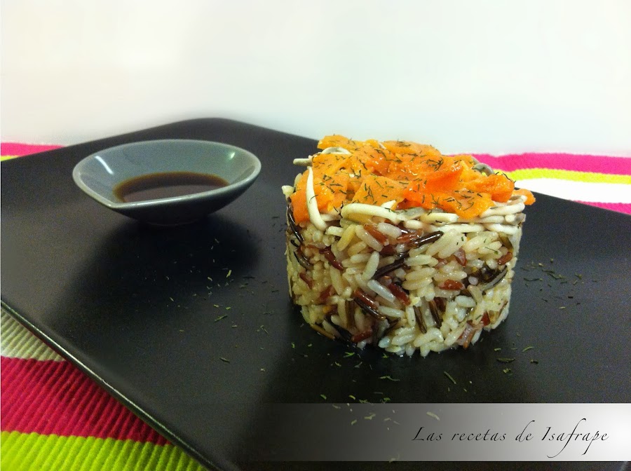Tartar de arroz salvaje con angulas sucedáneas y salmón