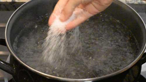 2. Una vez que el agua comience a hervir, agregamos 1 puñado de sal gruesa por cada kilo de cigalas o marisco en general.
