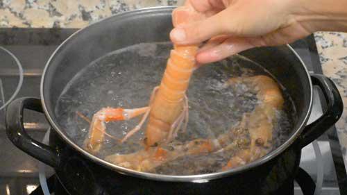 3. A continuación, agregamos las cigalas a la olla con agua hirviendo. Veremos que la cocción se rompe porque las cigalas estarán a otra temperatura diferente del agua.