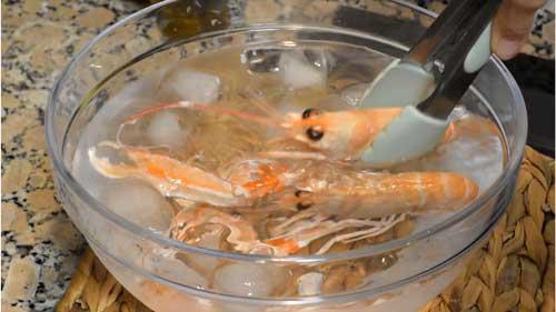 8. Dejamos que la cigala pierda temperatura dentro del agua con hielo y sal que acabamos de preparar durante un par de minutos y ya estarían listas para comer.