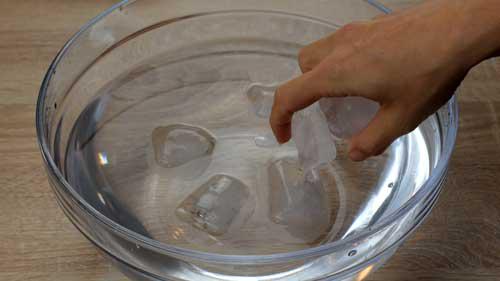 7. Disolvemos la sal en el agua fría removiendo con una cuchara de madera y echamos ahora los cubos de hielo.